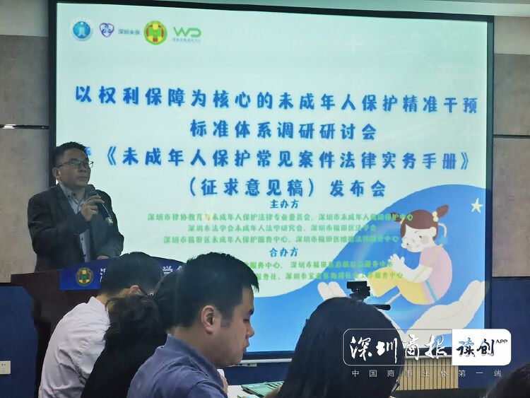 此次活动由第十一届深圳市律协教育与未成年人保护法律专业委员会(以下简称“教育未保委”)、深圳市未成年人保护救助中心、深圳市法学会未成年人法学研究会(以下简称“未成年人法学会”)、深圳市慈善事业联合会、深圳市福田区未成年人保护服务中心、深圳市福田区维德志愿法律服务中心联合主办。未成年人法学会秘书长龚江、教育未保委主任李严担任研讨发布会主持。