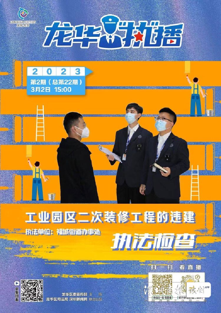 2023年是全面贯彻党的二十大精神的开局之年,也是实施“十四五”规划的关键之年。据了解,当前省、市、区、街道聚焦高质量发展,各类建设如火如荼,大量工业园区为适应产业升级转型也会对其生产、办公场所进行二次装修。本次直播将执法检查与现场普法相结合,不仅能为其他工业园区的装修项目树立执法典型,起到教育和警示相结合的效果,还能为市民提供相关执法事项的知识普及,更好起到监督和管理的效果。