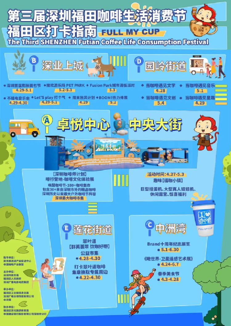 本次咖啡生活消费节以“1个主会场+2个分会场+2个社区+N个特色活动”为框架,主会场即卓悦中心咖啡节活动,两个分会场内容为深业上城“全国第二站的‘膨胀面包节’”和中洲湾“第一届潮流文化艺术节系列活动”。