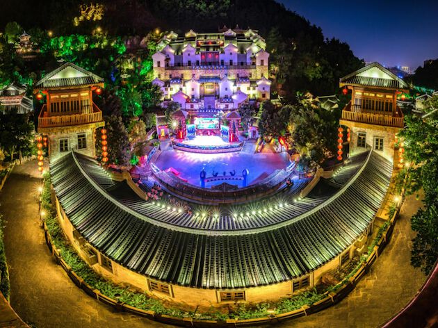 夜幕降临,梅州市客天下景区内,悠扬的乐声回荡在山谷内。景区特别策划了客家非遗文化节、客家非遗晚会等活动,迎宾竹竿舞、席狮舞展演、客家山歌大擂台、客家婚俗大巡游、杯花舞展演等一一登台,让游客享受视听盛宴。