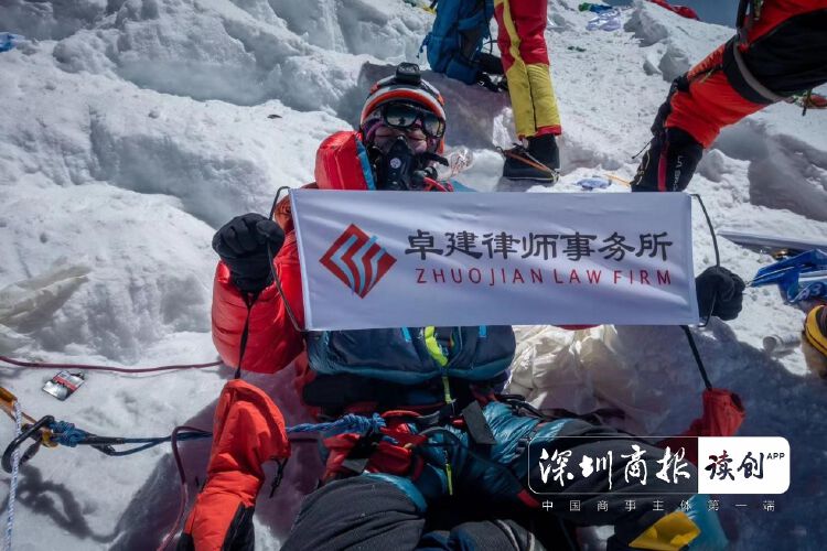 “当时我人都傻了,人又极度疲累,但我没有忘记一件事情。”登顶后的陈国庆,尽管脑子一片空白,却没有忘记把提前准备的福田律师旗帜和广东卓建律师事务所的所旗展开,并合影留念。之后,在冻风肆掠下,还未来得及看风景,便赶紧下撤了。