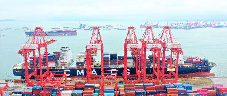 烈日当空的午后,国际班轮停靠在码头,巨大的红色岸桥上正在有序地作业,为轮船卸下集装箱。岸桥下面,拖车排着队把集装箱运送到堆场,但整个现场都是静悄悄的,巨型岸桥上几乎看不到一个操作员的人影。