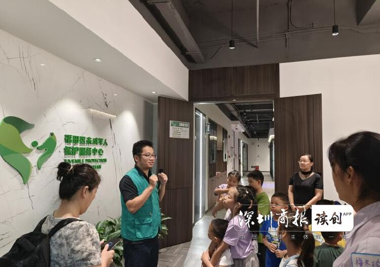 映入眼帘的未保中心口号“你的成长,我们守护”八个字掷地有声。“小朋友们,发挥你们的想象,猜一猜它像什么呀?”“像海豚”“像爱心”“像握手”……解说员与湾区少年的互动式问答,唤出未保中心logo的巧妙构思——FT(“福田”拼音缩写)、大手牵小手、比心。