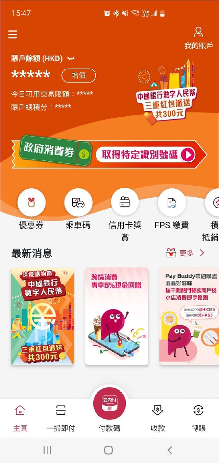 步骤一:客户可于BoCPay首页「最新消息」内点选活动图像,或点选左上角「≡」进入「数字货币专区」,并登记数字人民币钱包推广活动。