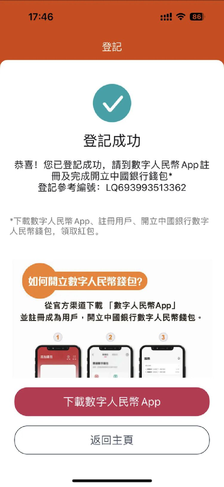 步骤三:登记完成。客户可实时下载「数字人民币」应用程序,开通数字人民币钱包。