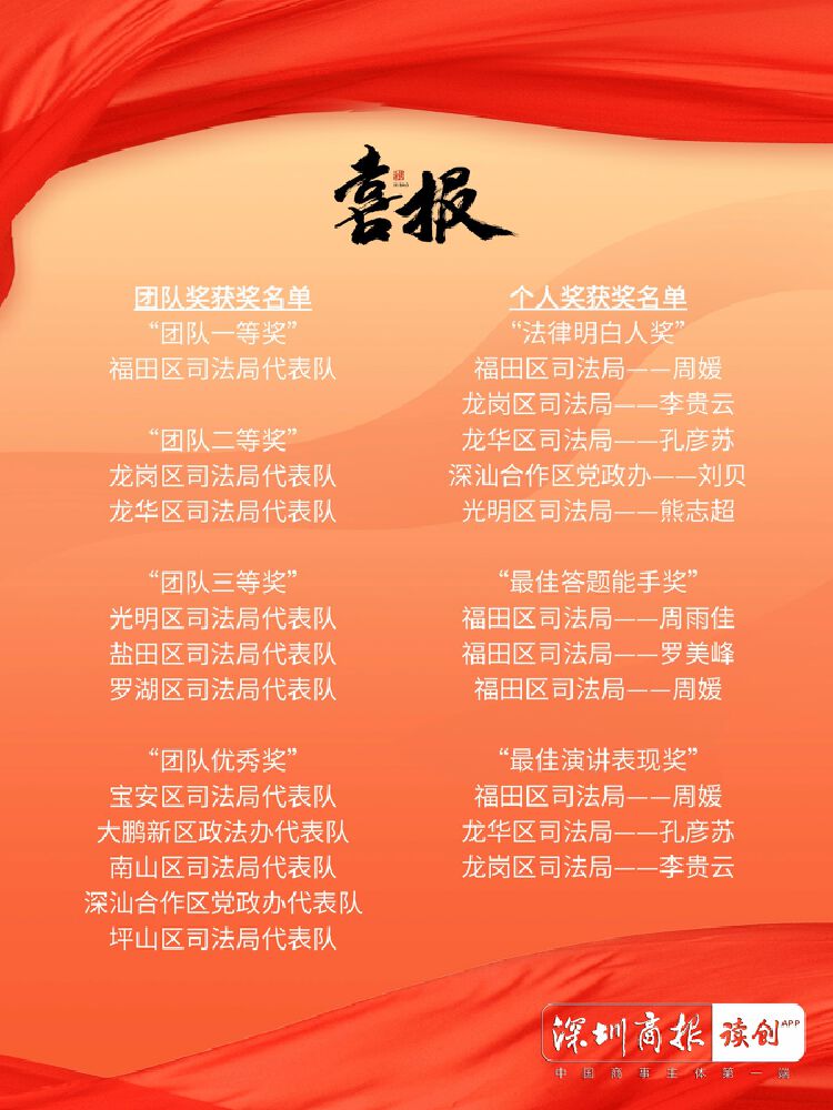 千帆竞发,首场初赛告捷!福田区司法局、龙岗区司法局和龙华区司法局等3支代表队获得本场竞赛的前三名。其中,福田区司法局代表队选手周媛更是将“法律明白人奖”、“最佳答题能手”、“最佳演讲表现”三个奖项揽入怀中。