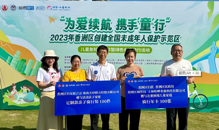 活动举办了捐赠及授牌仪式,上海哈啰惠普科技有限公司(哈啰骑行)向香洲区在册困境儿童家庭捐赠骑行年卡100张,珠海天印联合控股向参与本次骑行活动的亲子家庭赠送定制款亲子骑行装100件。香洲区民政局、香洲区妇联、香洲区城管局共同代表受赠人接收。为表彰哈啰骑行的儿童友好举措,香洲区委副书记、政法委书记韩俊锋为两家爱心企业颁发了儿童友好单位牌匾。