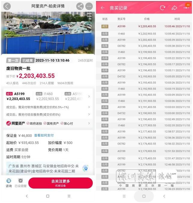 该批物资为废旧电梯、变压器、制冷机等物品,经评估上架、集中看样、竞价成交等环节,起拍价93.54万元。经过446轮激烈竞价,最终以220.34万元的价格成交,实现了国有资产高溢价处置。