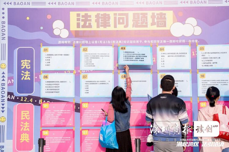 此外,深圳市公安局宝安分局、宝安区人力资源局、宝安区文化广电旅游体育局、宝安区卫生健康局等38家普法责任单位均在现场设置了展位,各单位结合各自领域的管理和服务职能,聚焦与企业、青少年、群众生产生活息息相关的法律援助、未成年人保护、电信诈骗等问题,通过普法展板、派发宣传资料、问答游戏等方式全方位展示本单位普法工作成果,并安排工作人员开展法律科普、法律咨询等服务。