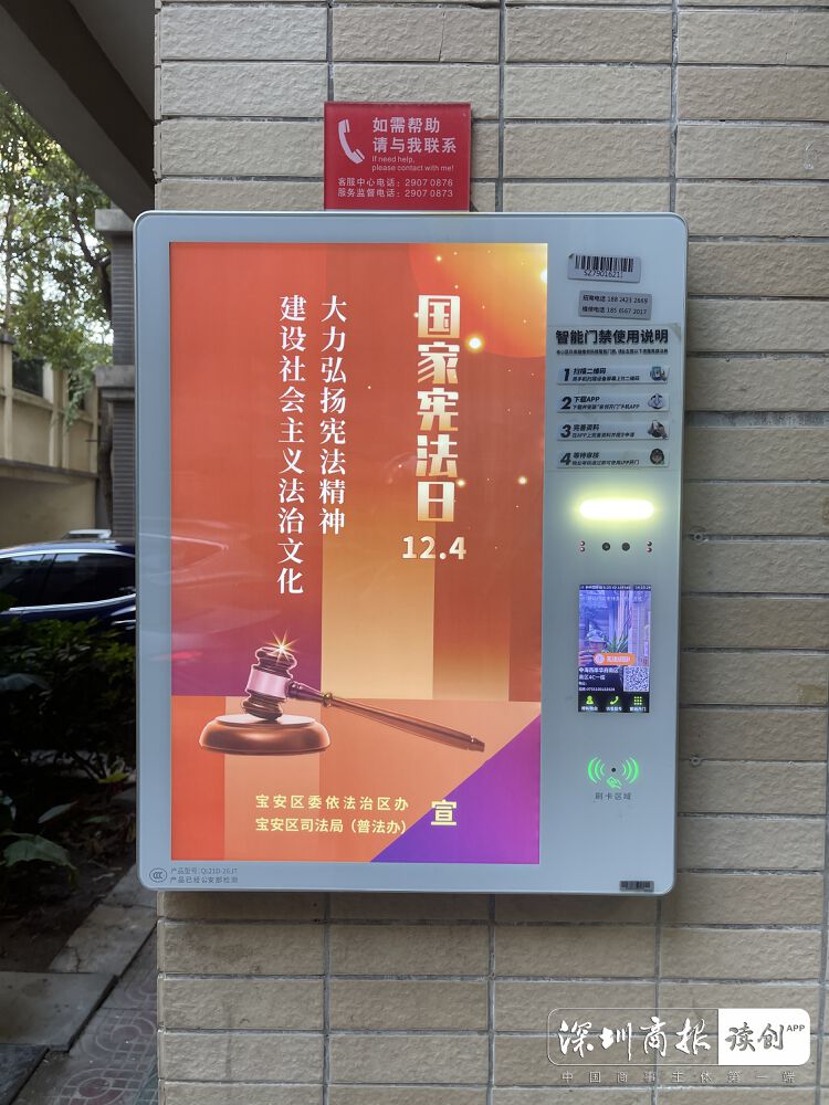 12月2日,深圳市宝安区委依法治区办、宝安区司法局为加强基层法治文化建设,不断创新法治宣传方式、拓展法治宣传新思维,打破过去旧的法治宣传模式,在人员集中的区域,利用广告灯箱开展法治宣传教育活动,发挥法治文化潜移默化的熏陶作用,利用社区单元门禁系统开展普法宣传。