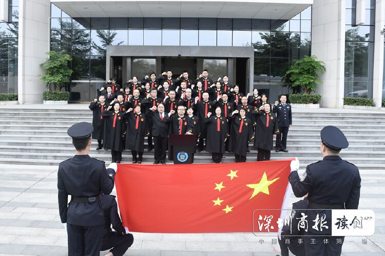 “12·4”国家宪法日8时30分,龙岗法院举行宪法宣誓仪式。在满怀激情地奏唱国歌之后,大家面向国旗庄严宣誓,铿锵誓言斩钉截铁,在朝阳中回响。