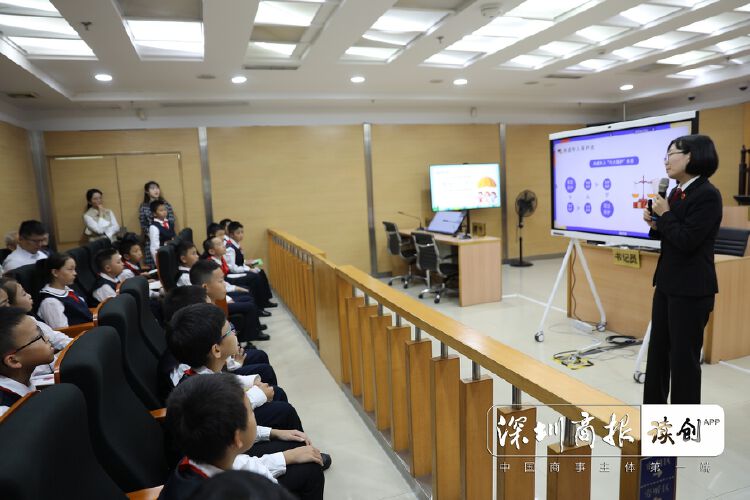 南山区政协副主席黄险峰在赠书环节“点赞”了这堂以“参观、互动、体验”为设计理念的情境式普法课,并将西丽法庭定制的法治图书“大礼包”一一送到孩子们手中。