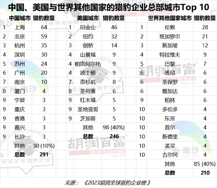 胡润研究院在全球找到747家猎豹企业。中国和美国分别以291家和246家领先,占全球猎豹企业总数72%。胡润据此表示,不管是猎豹还是独角兽企业,基本上全球分为美国、中国和世界其他国家三块。而未来世界500强更多会来自中美两国。