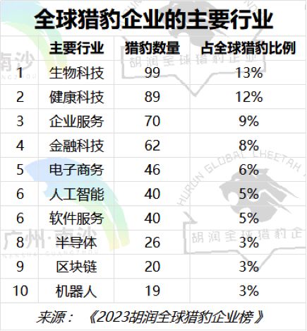 上榜企业医疗健康和金融服务行业最多,其次是企业管理解决方案和零售。生物科技和健康科技行业以99家和89家猎豹企业领先,其次是企业服务70家,金融科技62家,电子商务46家,软件服务和人工智能各40家。
