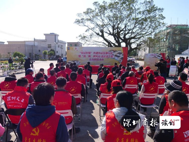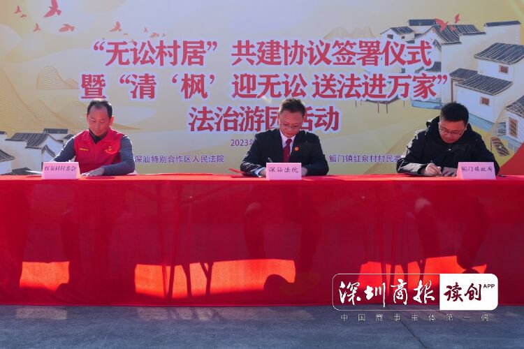 当日上午,伴随着冬日暖阳,红泉村排角文化室广场门庭若市,热闹非凡。活动首先举行了“无讼村居”共建签约仪式。深汕法院与鲘门镇政府、红泉村委会共同签署了《关于加强诉源治理合力创建“无讼”村居工作备忘录》,确立了无讼村居的创建目标和原则,与共建村建立纠纷处理、诉调对接、风险预警、巡回审判、重要会议列席、法官指导等机制。