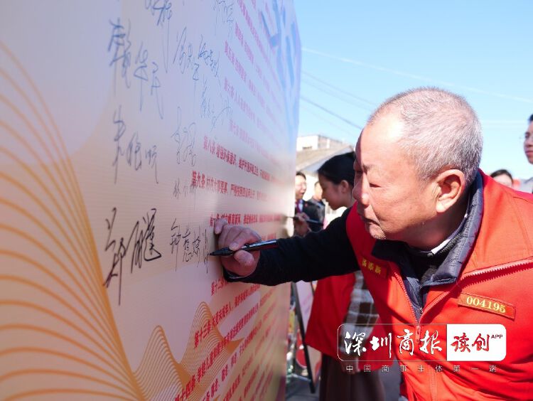 随后,在叶宣的带领下,红泉村村小组组长、党员以及村民代表郑重地在《村民公约》上签名,表示将共同遵守和弘扬《村民公约》。红泉村的《村民公约》是红泉村委在深汕法院的指导下,融合了法律知识、文明乡风和无讼理念等内容,将“无讼”的和谐理念融入村民公约,激发村居文明内生动力,引领社会风气向上向善。