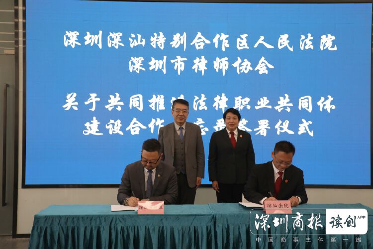 仪式上,深汕法院和深圳律协签署了《关于共同推进法律职业共同体建设的合作备忘录》,双方约定构建良性互动,凝聚共识的“亲”“清”法律职业共同体,保障法官公正司法、律师依法执业,共同维护法律的正确实施,维护社会的公平正义,维护司法权威。