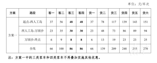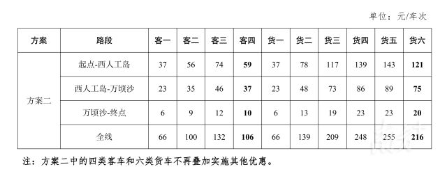 听证方案二:项目全线车辆通行费收费标准为66元/标准车次,执行全省高速公路统一的车型分类方式和收费系数;其中,40座以上大型客车和六类及以上货车(含六类以上专项专业车)收费系数按现行系数的80%执行,其收费标准分别为106元/车次、216元/车次。