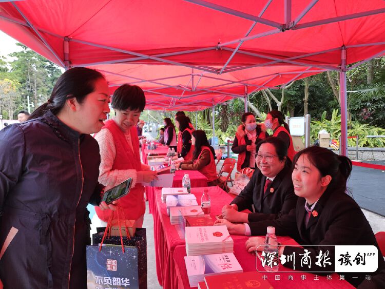 当天下午,龙岗法院还参与龙岗区妇联开展的龙岗区2024年“三八”普法宣传活动。龙岗法院少年家事审判团队的法官和社工与现场群众“拉家常”,有针对性地围绕生活中常见的妇女儿童、家庭教育热点难点问题进行释法答疑,并派发法治宣传材料,引导群众以科学的方式教育孩子,解决家庭矛盾纠纷。