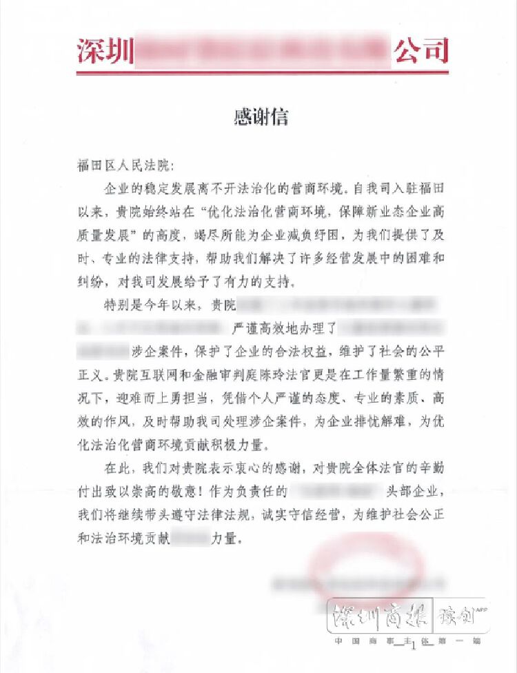 “法院始终站在‘优化营商环境,保障新业态企业高质量发展’的高度,竭尽所能为企业减负纾困,为我们提供了及时、专业的法律支持,对公司发展给予了有力的支持。”事后,某互联网搬家公司给法院发来《感谢信》。