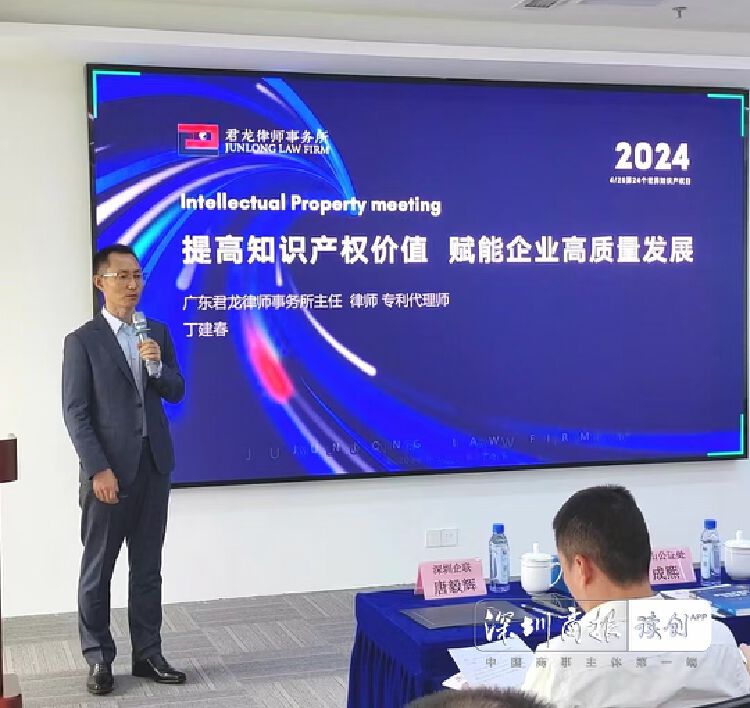 主题分享环节,国家专利展示交易(深圳)中心首席顾问、广东省知识产权局专家库专家、广东君龙律师事务所主任丁建春律师为现场企业代表解析了知识产权的技术价值、法律价值、市场价值,并通过丰富案例展示了高价值专利如何为企业发展赋能。
