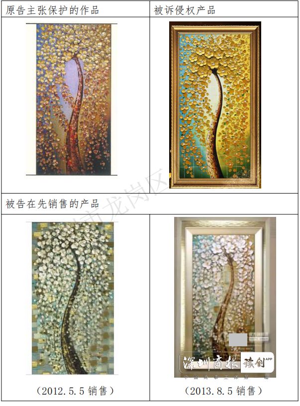 法院另查明,两被告公司均从事油画、工艺品等的销售业务,其当庭主张并未侵权,并提交网页截图及视频证据,显示由其经营的天猫店铺早在2012年5月至2014年2月就有“发财树”“幸福树”等油画产品的销售记录,相关作品除了部分着色存在细微差别外,构图造型与被诉侵权产品几乎一致。此外,两公司还辩称,原告未必是涉案美术作品的作者,作品即使为原告所作,也存在极大的抄袭之嫌。原告利用版权形式审查的漏洞申请版权登记,取得作品登记证书之后再提起高额赔偿诉讼,目的在于谋取不当利益,为恶意诉讼。