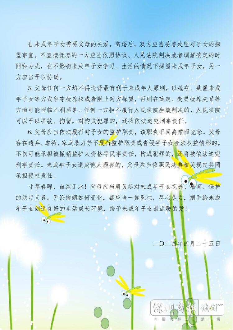 “我们虽然离婚了,但仍然是小李的爸爸妈妈,一定努力呵护她健康成长。”刘女士和李先生在认真听取并阅读提示后均承诺,今后一定尽到做父母的责任,给予小李更多的关心与关爱,努力为孩子创造一个良好的成长环境。