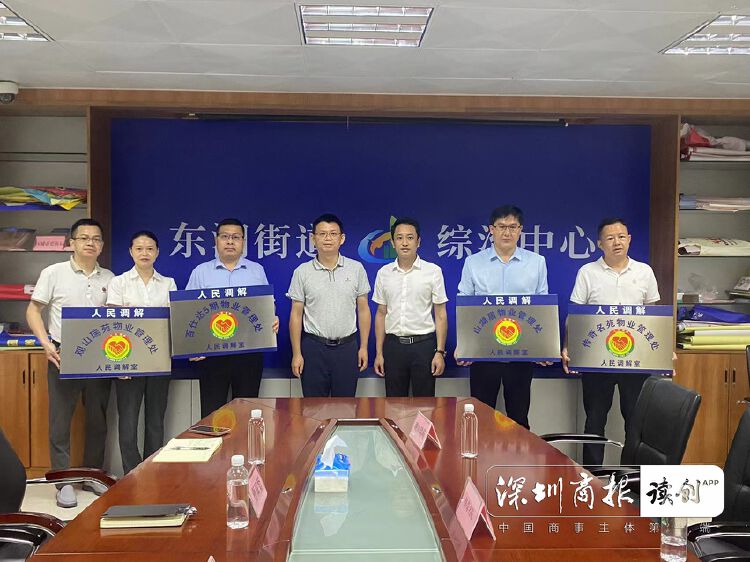 东湖街道平安法治办有关负责人及观山瑞苑、山湖居、百事达五期、传祺名苑物业管理处代表共同参与了新增物业调解室的揭牌仪式。