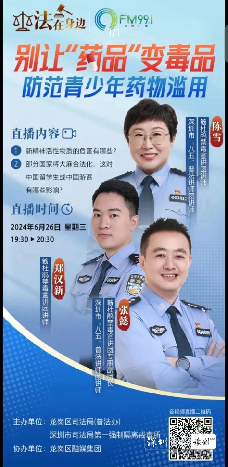 6月26日,深圳市司法局第一强制隔离戒毒所、龙岗区司法局携手龙岗区融媒集团龙岗广播FM99.1共同举办《法在身边》第四期音视频同步直播栏目。