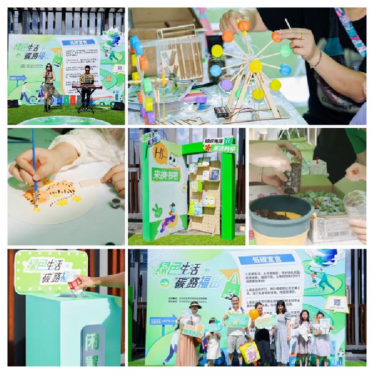 活动设置多个低碳趣味互动体验区域,包括低碳主题演唱会、低碳知识打卡区、绿色团扇创意绘区、低碳图书漂流区、废弃物再利用实验区、闲置回收区、绿色低碳生活倡议书签订区等。小朋友们聆听曼妙音乐的同时,绘制绿色团扇,拼装新能源小风扇,利用废弃瓶盖等材料组装风车,将多肉植物种植到回收的水瓶里,交换旧书籍进行漂流共享,签订绿色低碳生活倡议书等,加深对双碳的理解,将低碳理念尝试融入生活之中。