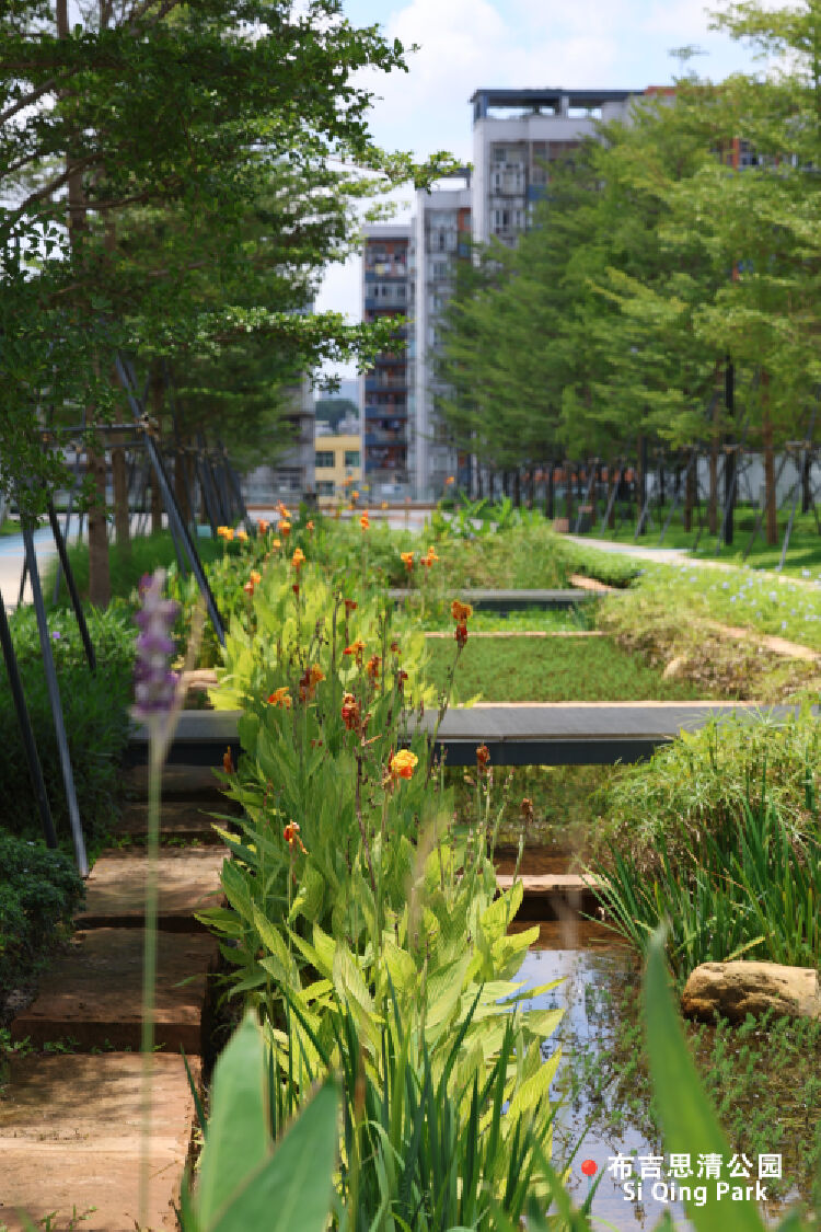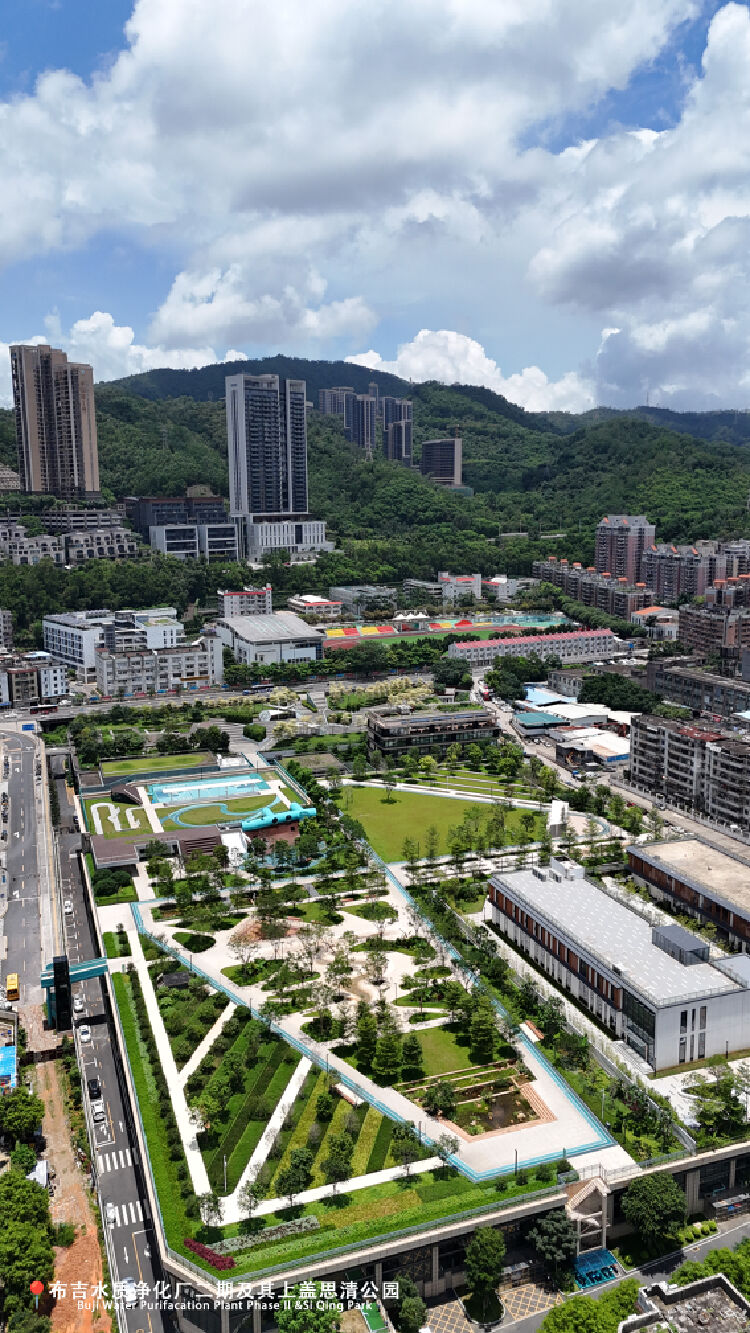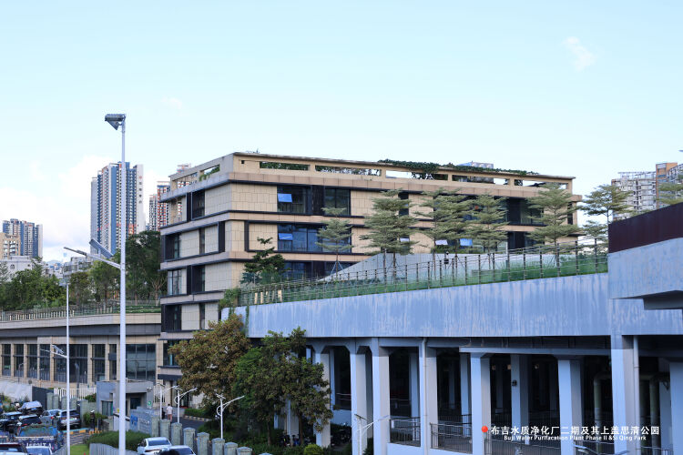 布吉水质净化厂二期工程采用半地下式形式建设,是一所资源节约型、环境友好型、高标准花园式生态污水处理厂。水厂上盖有思清公园,配置了异形体息亭、雨水花园、人工湿地、雕塑小品等设施,以“生态、开放、亲水、教育”为主题打造了一个具备科普宣传功能,展示先进的环保工艺及生态保护理念,成为充满活力的生态“空中公园”。2023年,深圳布吉思清公园(布吉水质净化厂上盖公园建设工程)获评中国风景园林技术领域最高荣誉——2022年度中国风景园林学会科学技术奖。