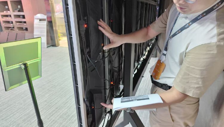 工作人员向记者介绍艾比森屏幕的拼装式构造。