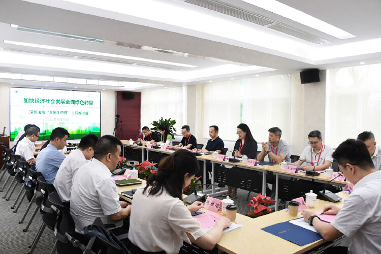 视察结束后,代表委员们参加由市中级法院组织召开的“加快经济社会发展全面绿色转型”主题座谈会,通过观看《大鹏湾畔“枫”景独好》宣传片,全面了解大鹏法庭的环境资源专业审判、开展生态环境修复、参与基层社会治理、普法宣传教育等多方面工作。在座谈中,市中级法院相关负责人首先向代表委员通报了深圳法院服务保障生态文明建设的工作情况。近年来,深圳法院已构建起跨类型、跨区域的环境资源司法保护模式,办理了一批涉环境资源的刑事、民事、行政大要案和新类型案件,也妥善处理了一批备受老百姓关注的涉环资民生案件,多个案例入选上级法院发布的典型案例。