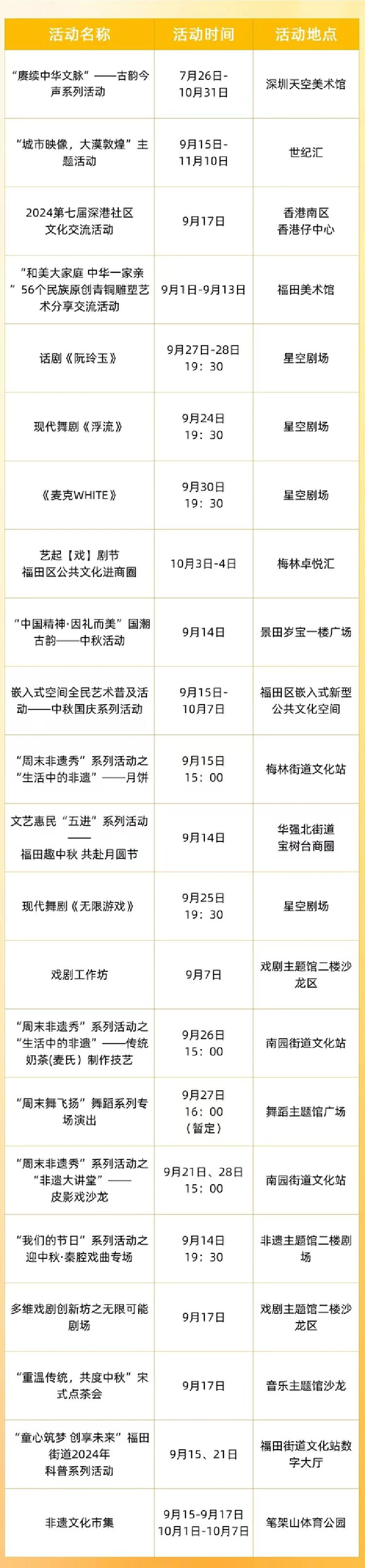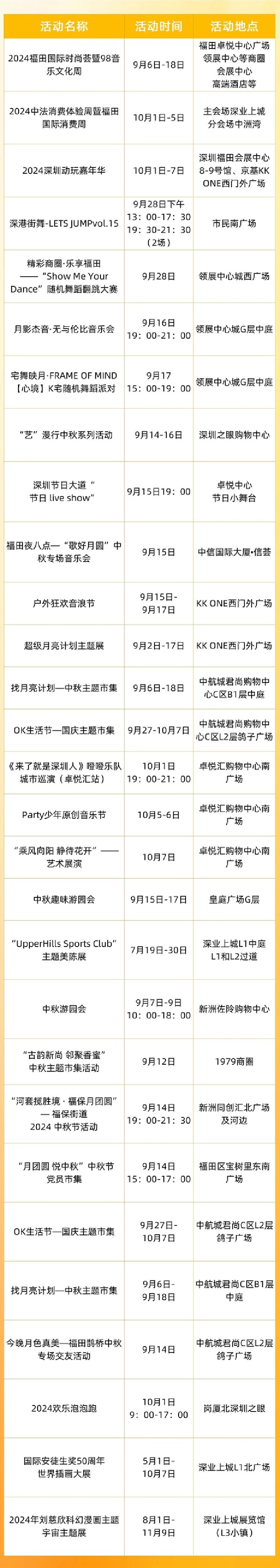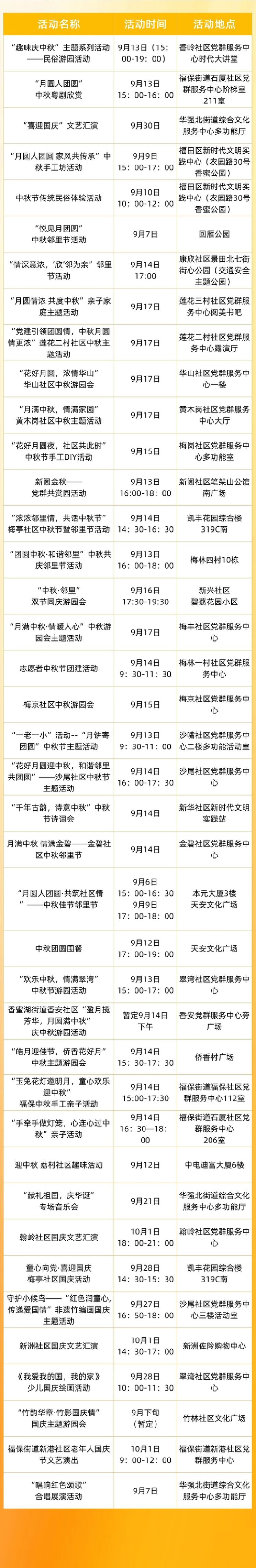 中秋、国庆假期前后,福田将举办国际消费周主题活动,以及以“中秋、国庆”为主题的音乐会、游园会、主题集市、展览、舞蹈表演等一系列活动。