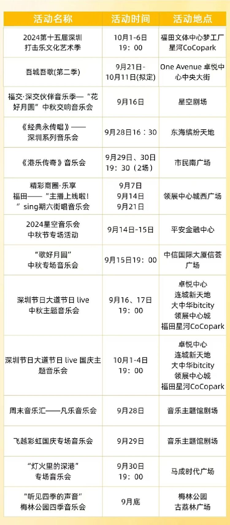围绕中秋、国庆两个节日,专门策划多场中秋、国庆专题音乐会,推出2024第十五届深圳打击乐文化艺术季、福交·深交伙伴音乐季—“花好月圆”中秋交响音乐会、《经典永传唱》——深圳系列音乐会等品牌活动。