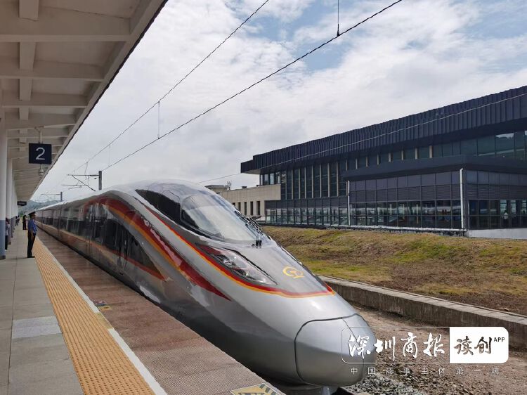 今日11:30,梅龙高铁首趟列车G8491从梅州西站开出,一路向广州加速驶去。广铁供图