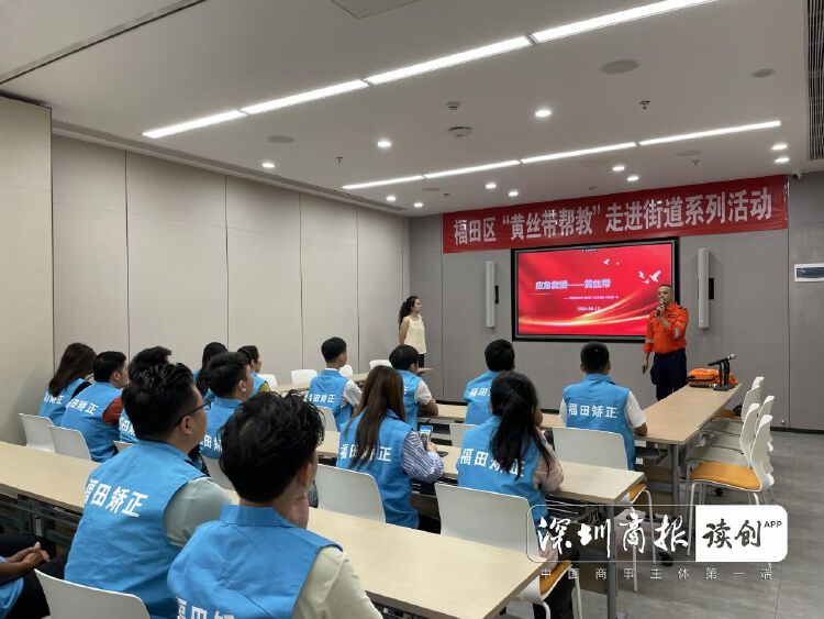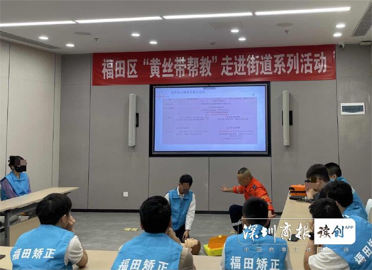 培训在福田街道平安建设中心多功能活动室举行,采取理论讲解与实操演练相结合的方式。995应急救援广东大队深圳中队教官、民盟福田十五支部副主委唐一智针对大型救援现场和个体个人救护进行授课。民盟福田总支“黄丝带”公益志愿者王博则以“心脏骤停与心肺复苏术”为主题,从心脏骤停、生存链、心肺复苏术、高质量心肺复苏四个方面讲解,层层递进、深入浅出,同时,借助人体模型和AED,通过实操演示、手把手指导、模拟体验等方式,让社区矫正对象了解急救的重要性和紧迫性,学习对心梗或脑梗人员的有效救护。
