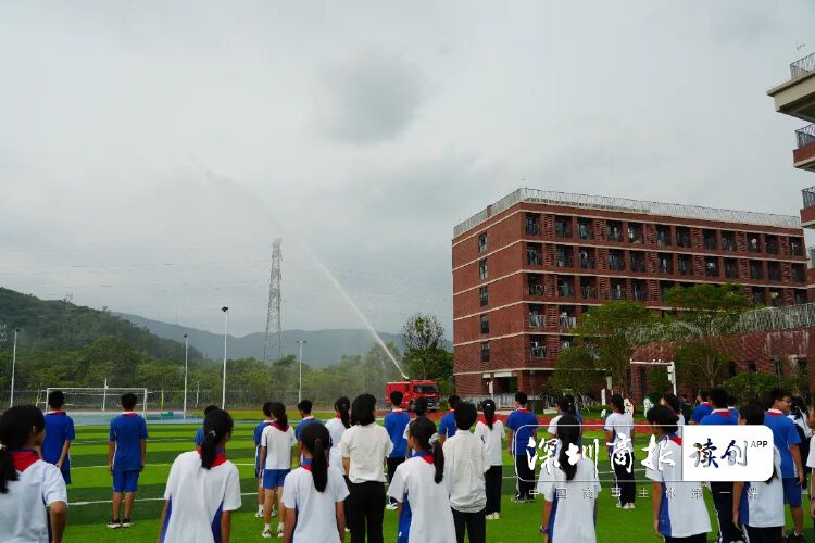 “呜、呜、呜……”深圳中学大鹏学校报告厅内,学生们正在听课,突然,一阵阵急促的“火灾警报”响起。学生们在老师、消防志愿者、物业安保人员的引导下,手捂口鼻、弯腰低头,快速有序地撤离到安全区域。随后,消防员进行了实战演习和绳索救援技术展示,校园重新恢复宁静。