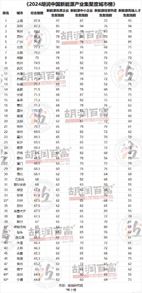谈及中国值得关注的新能源生产基地,胡润介绍,上海有特斯拉超级工厂、上汽、科达利、宁德时代电池模组生产基地;深圳有比亚迪汽车、科达利新能源电池生产基地;合肥有蔚来汽车、比亚迪汽车、阳光电源、国轩高科电池生产基地;常州有比亚迪、理想、中创新航生产基地;北京有理想汽车、北汽新能源、卫蓝新能源生产基地;鄂尔多斯有远景动力、晶科能源、亿利洁能生产基地。