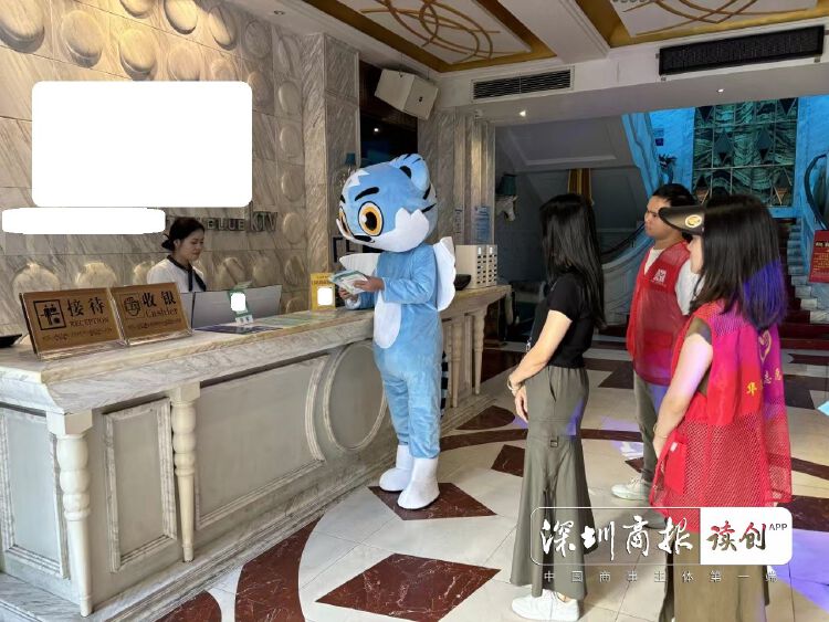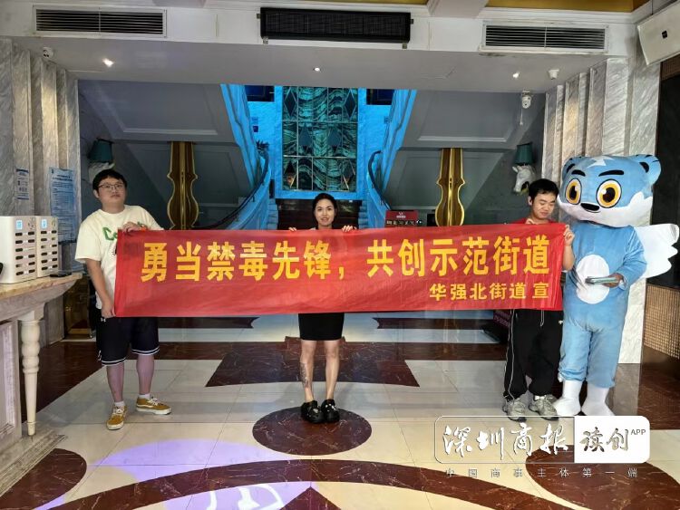同时,社区志愿者还化身禁毒卡通形象“粤虎”和场所从业人员进行有奖问答互动并合影留念。