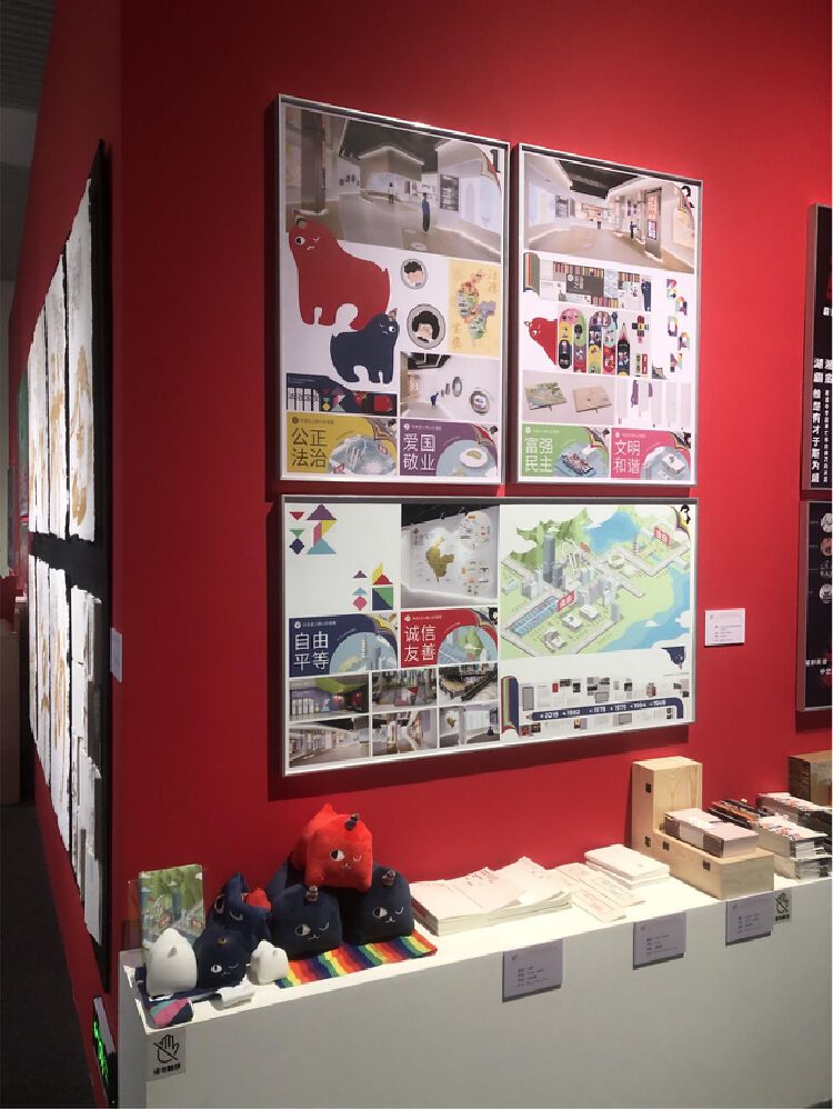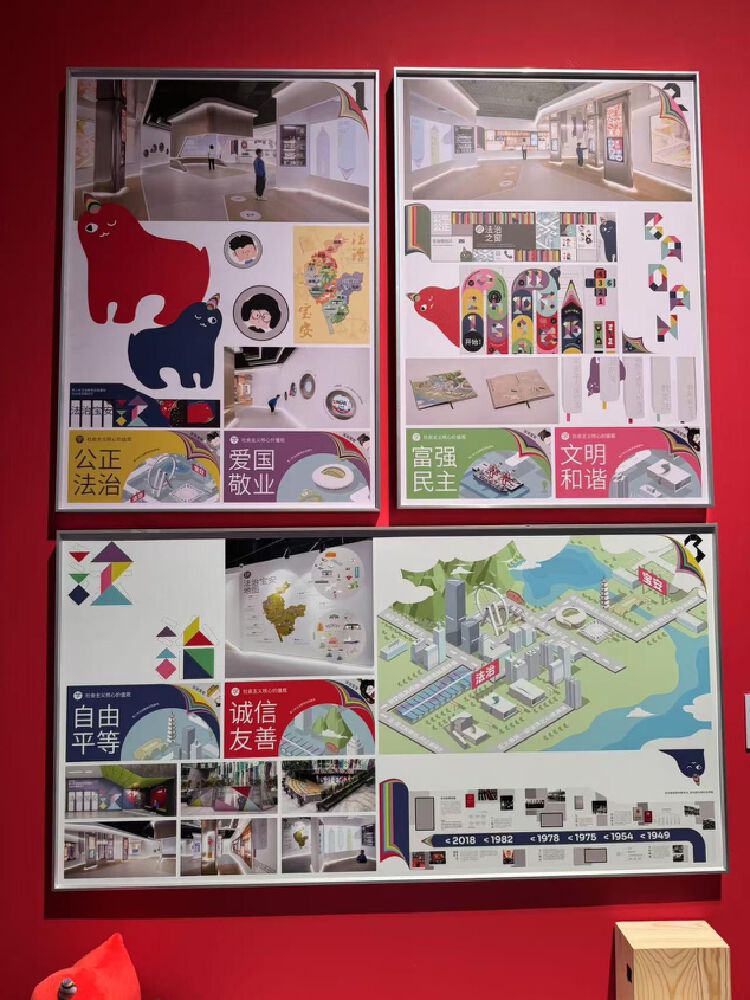 展厅设计的视觉平面主题贯穿于不同的空间、装置、文创、多媒体等不同媒介之间,各区域通过卡通化法治神兽獬豸、翻书页、七巧板等元素进行串联,呈现出多维度的视觉层次感。视觉平面涵盖的主题区包含法治宝安地图互动磁铁装置、圆形系列民法典故事墙、文创产品与视觉图案虚实结合的“法治之窗”展柜、未成年人保护主题的户外装置“法治之山”等。