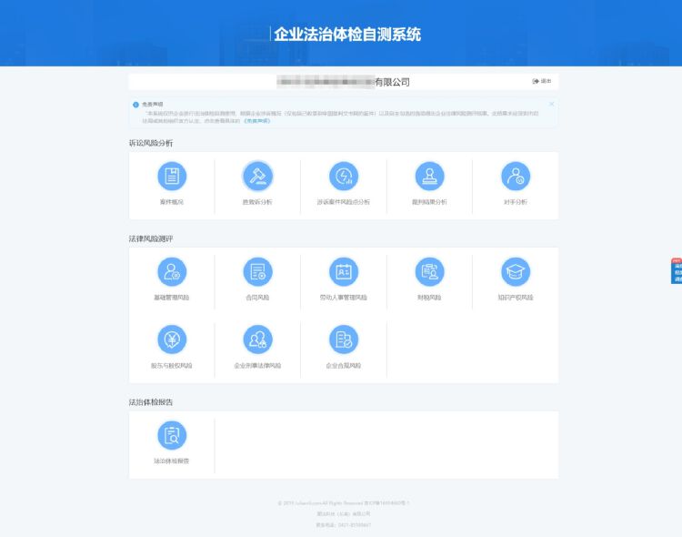 该系统以法律大数据为基础,运用互联网、云计算等信息技术,为企业排查防范法律风险提供免费的智能化检测服务。其中包括三大组成模块:一是企业诉讼风险分析模块。通过裁判文书网公开的大数据信息,输入企业名称即可一键检测企业的涉诉情况。二是企业法律风险测评模块。提供基础管理风险、合同风险、劳动人事风险、财税风险、知识产权风险、企业合规风险等六方面的风险诊断报告,帮助企业迅速定位、改善自身依法经营方面的薄弱环节。三是“法治体检”报告模块。系统根据企业的涉诉情况,以及企业法律风险测评结果,出具可视化“法治体检”报告,报告包含检测评价、企业法律风险点提示、风险防范建议等内容,帮助企业更准确地定位、更有针对性地防范化解法律风险。