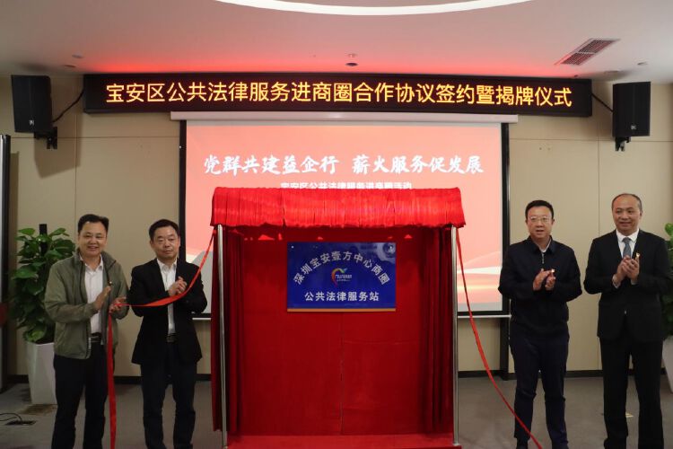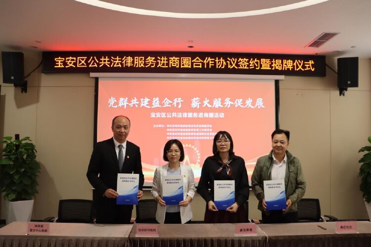 现场举行《宝安区公共法律服务进商圈合作协议》签约暨揭牌仪式。签约仪式上,四方代表共同签署了《宝安区公共法律服务进商圈合作协议》,并为“宝安壹方中心商圈公共法律服务站”揭牌,正式启用服务站。