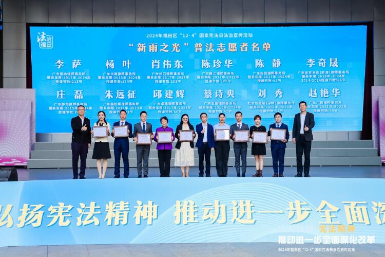 2014年以来,福田区司法局联合福田区教育局、福田团区委及公益社会组织维德法律服务中心开始实施青少年普法项目“新雨计划”,共创新开发了9个系列、97节普法课程,授课范围已遍及深圳市8个区190余所中小学,并通过线上线下等形式推广至全国31个省、自治区、直辖市的1900多所中小学。为展示“新雨计划”近年来的成果,现场播放了“宪法进校园”的成果展示视频,并按照授课时长,对12名表现优异的普法志愿者颁发“新雨之光”纪念证书。