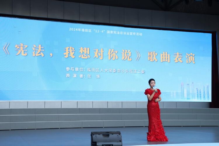 文艺弘扬法治,法治滋养文艺。活动中,福田区人大常委会沙头街道工委工作人员、福田区社区“法律明白人”代表、人民调解员代表带来宪法主题节目表演,以法治文艺作品引导人们崇德尚法、践行法治。