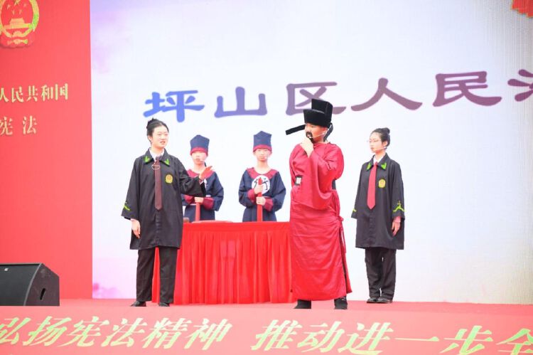 在坪山区新入职公务员进行了庄严肃穆的宪法宣誓后,伴随高亢嘹亮的开场歌曲《江山》,法治文艺汇演正式拉开帷幕。深圳法院彩虹文艺宣传队小品《司法调解员》、原创歌曲《尚法歌》,坪山区第二外国语学校师生自编自导自演的《特别法庭》、快板《民法典你我她》等形式多样的法治节目轮番上演,给现场观众送上了一顿丰盛的法治文化大餐。