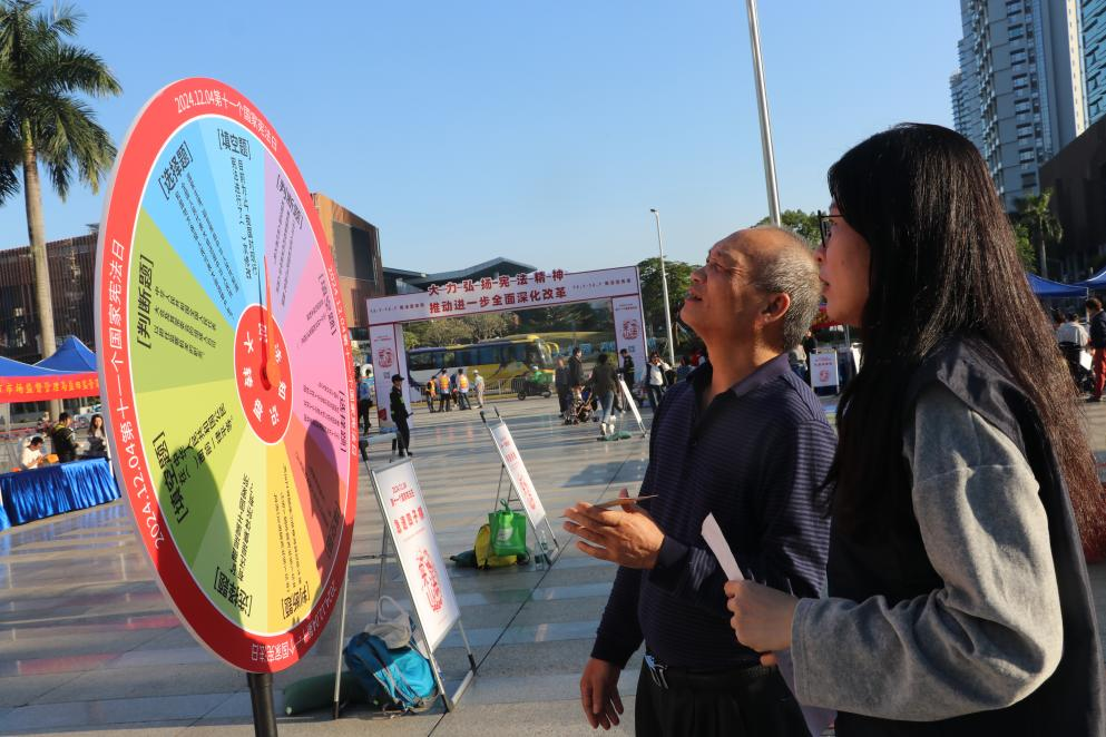 “我国现行‘宪法’是哪年颁布实施的?”“目前为止,我国对‘宪法’进行了几次修改?”……市民群众正参加普法游园集市里“宪法大转盘”游戏。过往市民通过领取宪法知识互动游戏体验卡,完成对应游戏,获得印章,收集一定数量印章即可获得对应的法治宣传礼包。