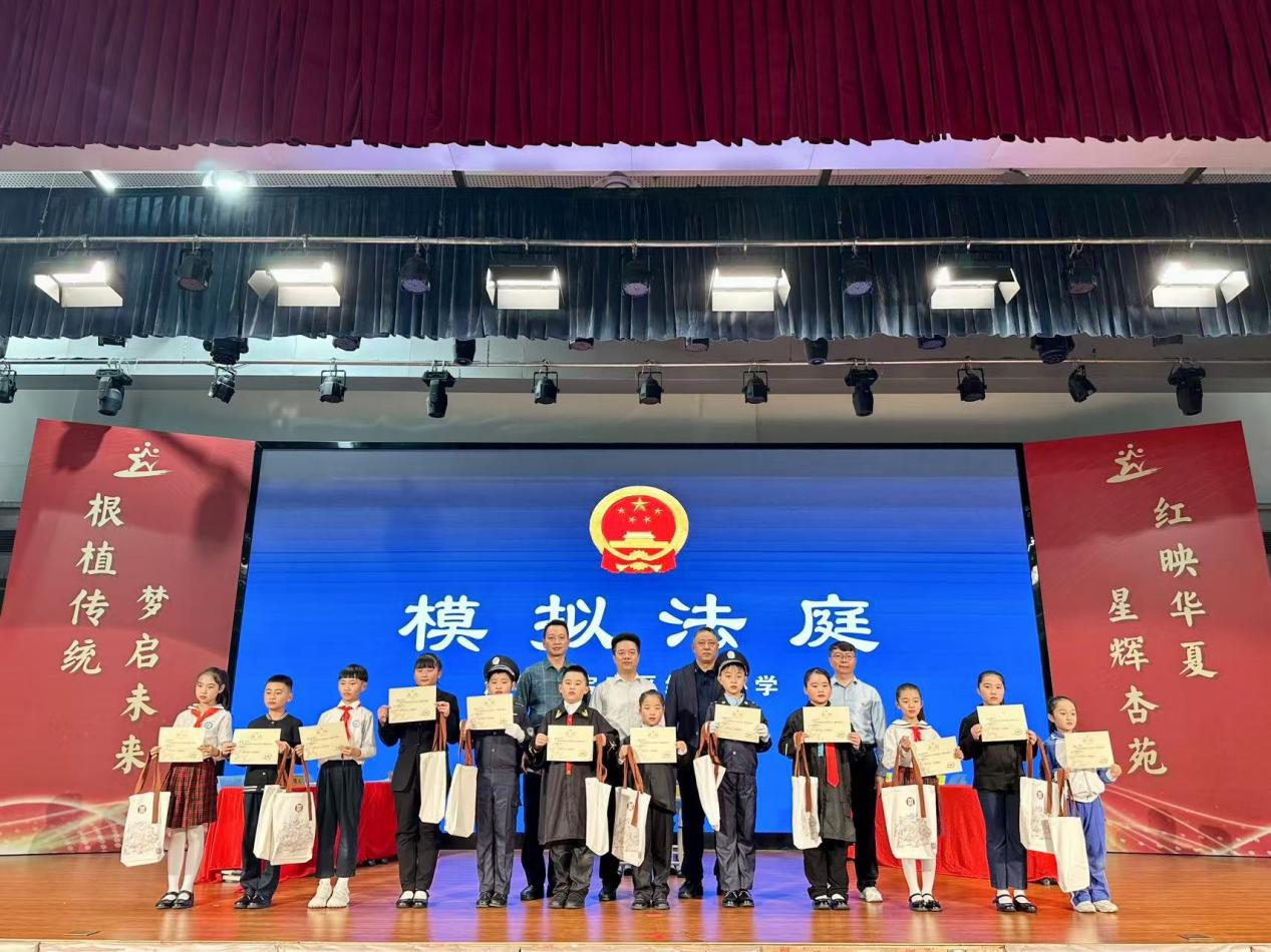 现场,钟校长和刘庭长为参与此次模拟法庭的“学法好少年”的同学们颁发荣誉证书和普法宣传品。