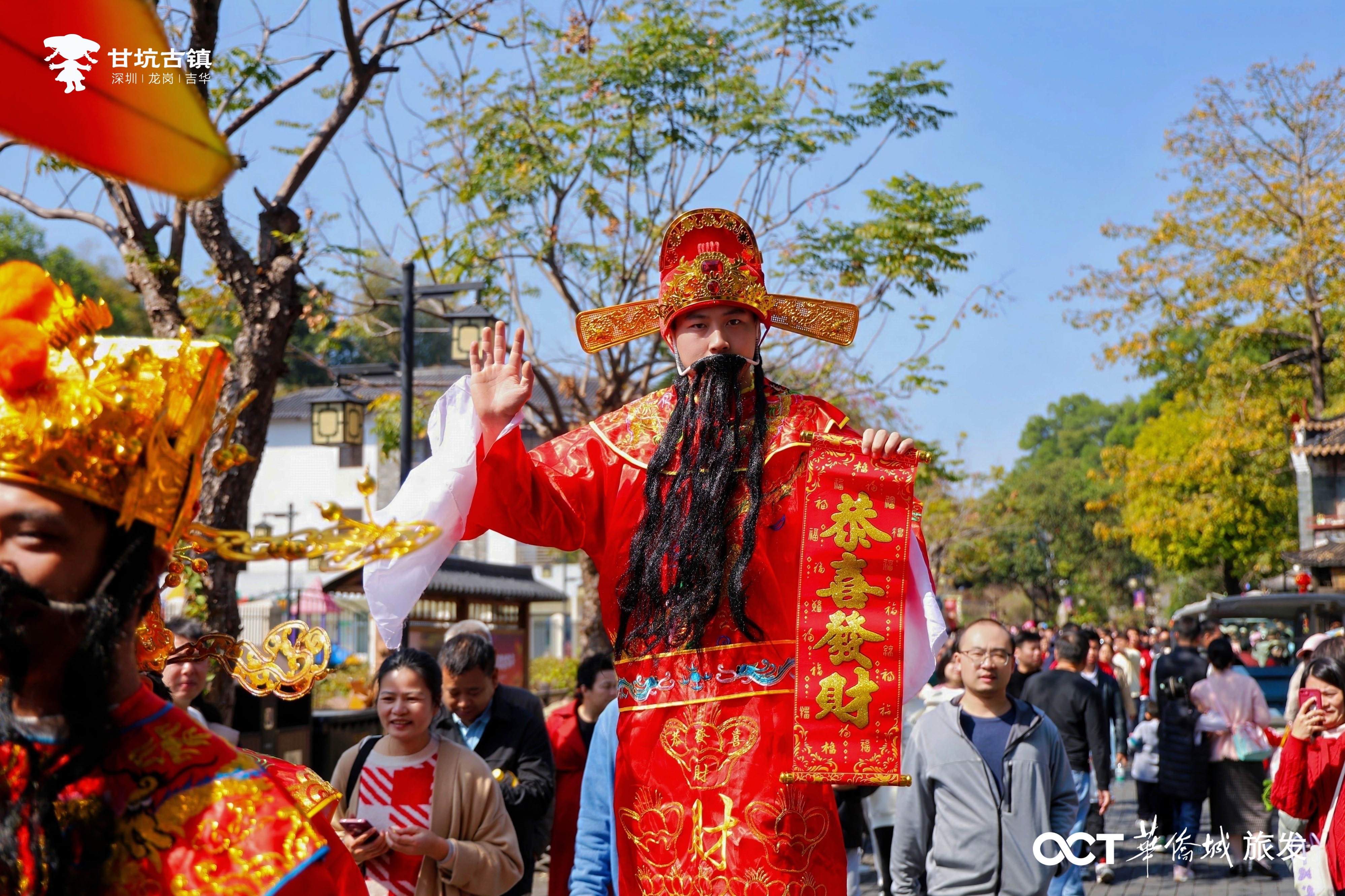 作为深圳村落文化地标的甘坑古镇,春节期间张灯结彩。“(ái,我)旺客家年”节庆系列活动融合了非遗民俗文化,推出鱼灯巡游、古风杂技、趣味亲子营等活动热闹非凡,让游客感受到了独有的客家风情。