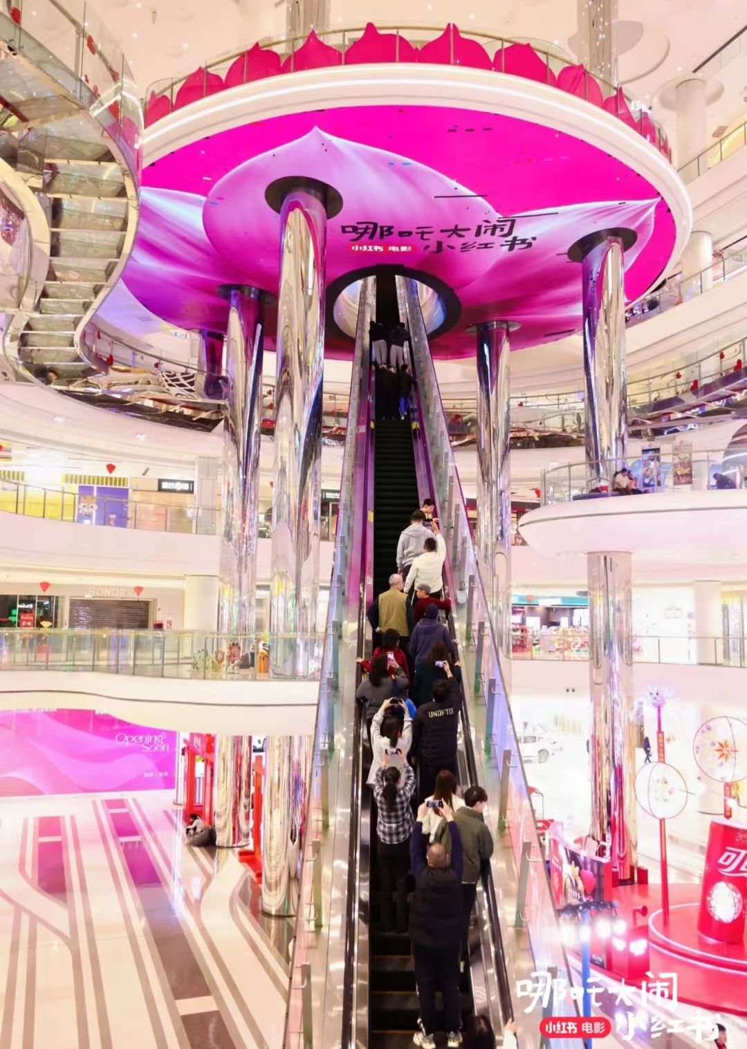 记者在现场看到,仁恒梦中心巨型发财树的金黄色十分耀眼,顾客纷纷合影打卡祈福,寓意来年“发大财”,更有变脸杂耍火壶秀等非遗演绎共贺新春;在龙岗星河 COCO Park 举行的“钱眼里市集”“好事发生灯笼长廊”“Boom Boom Rich 财神展陈”等喜庆活动和展陈,非遗糖画糖人、章鱼小丸子等香气四溢的美食摊吸引了众多游客尝鲜;山姆会员店客流同比增长10%,在店内消费满688元送茶具礼盒、消费券,互利惠民;龙岗万达广场乘着动画电影《哪吒 2》热映的东风,推出了小红书x哪吒主题二创主题美陈,商场标志性的长扶梯终点被包装成了“莲花宝座”,各种COSPLAY、光影特效和周边文创引来不少游客打卡下单。